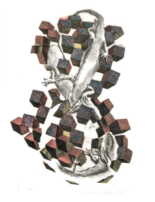 A circle-formation like the number "8" made up of cubes and lizards. Please, take a moment and tell me what you see in this picture.